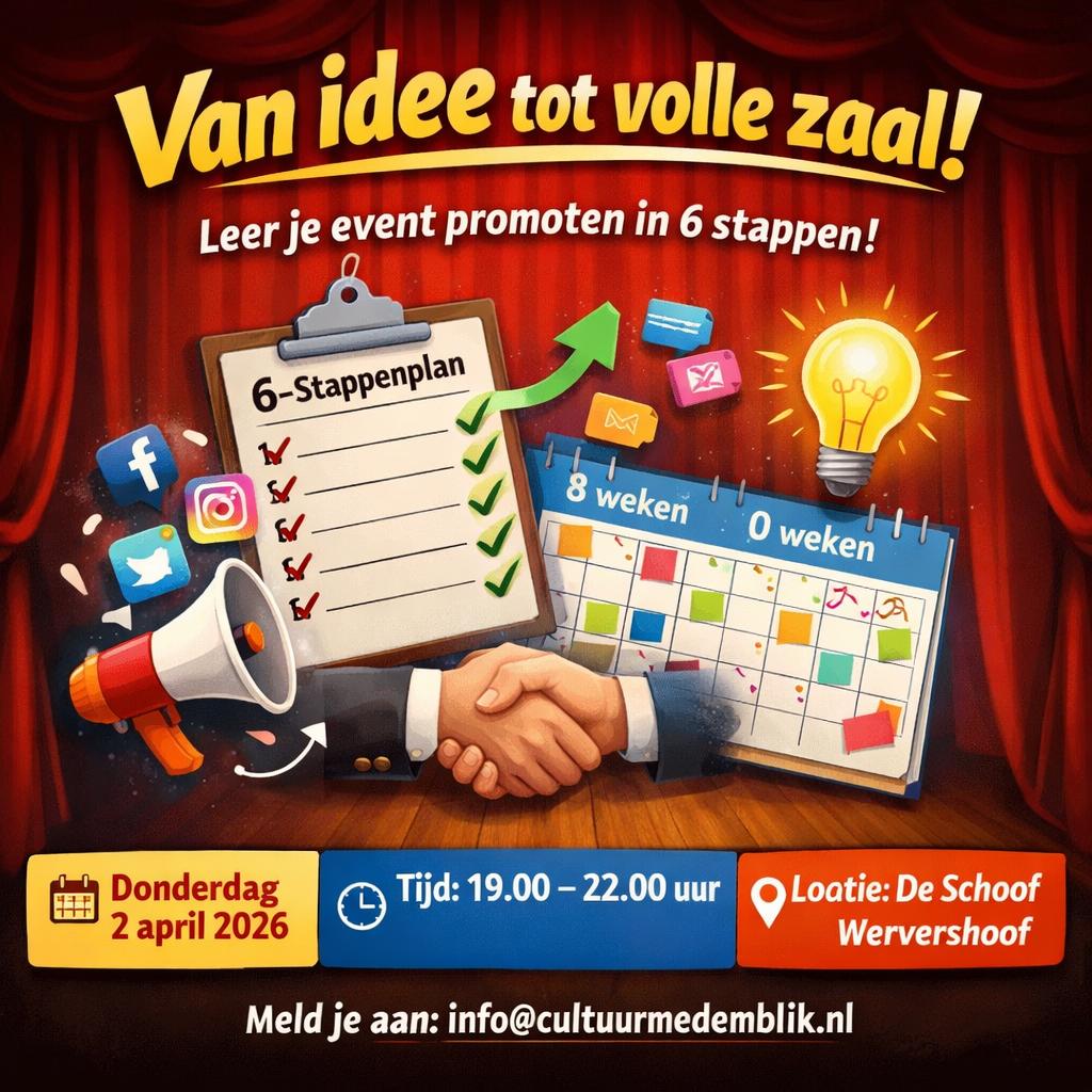 In de workshop ‘Van idee tot volle zaal’ krijg je een praktisch 6-stappenplan voor eventpromotie, inclusief tips voor slimme kanalen, samenwerkingen en een overzichtelijke contentkalender (8–0 weken).